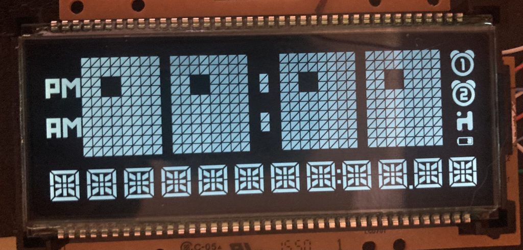 The digits of the clock are made up of squares of 8 of these little triangles plus the center delineator and the bottom is a 12 digit 15 segment alpha numeric line with a : and a . Plus the other various icons. So I will work on this later too when I get the chance.