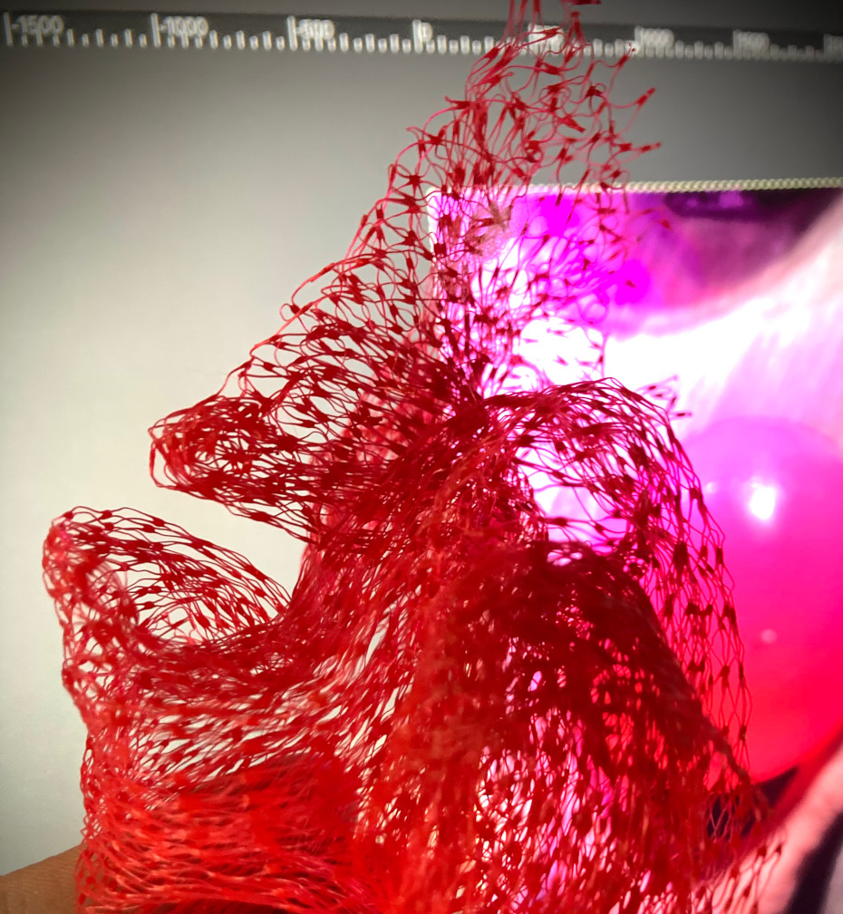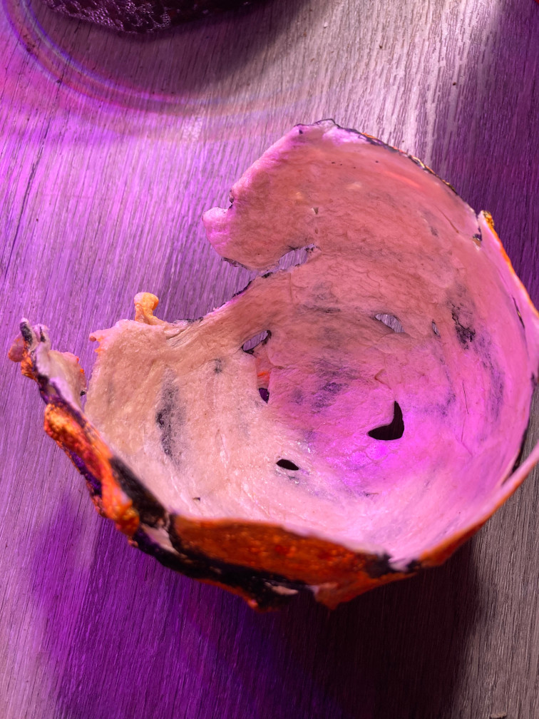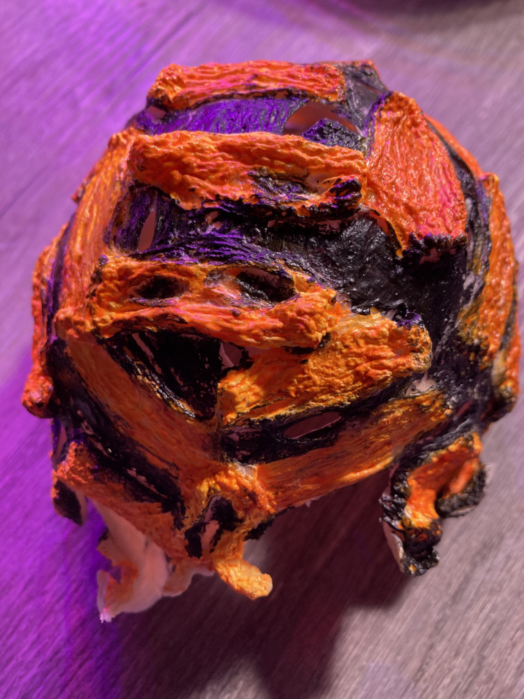 The next day I painted it with alcohol inks as it was still attached to the mesh. Alcohol solvents seem to work very well at not dissolving the starch into mush. I left it to dry overnight and then pealed off the mesh from inside.